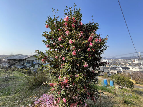 畑の隅にある椿が満開