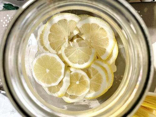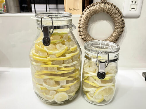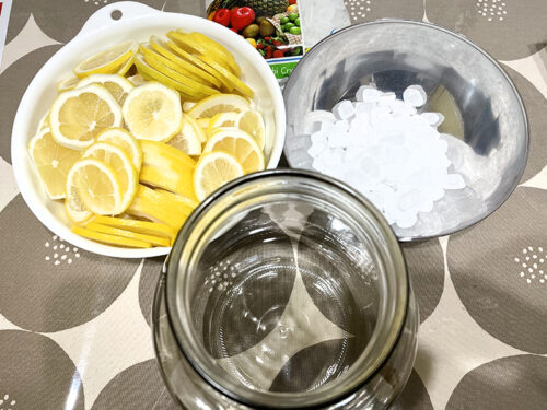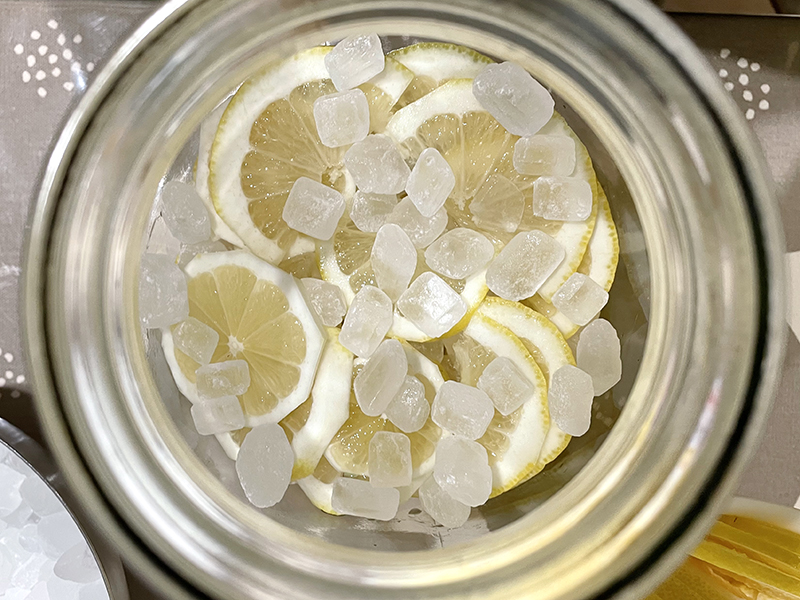 スライスしたレモンを、氷砂糖と清潔な瓶に交互に重ねていくだけ