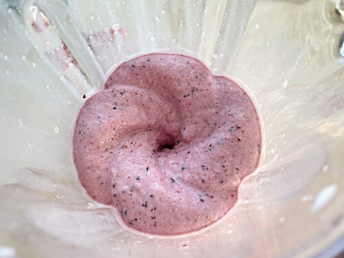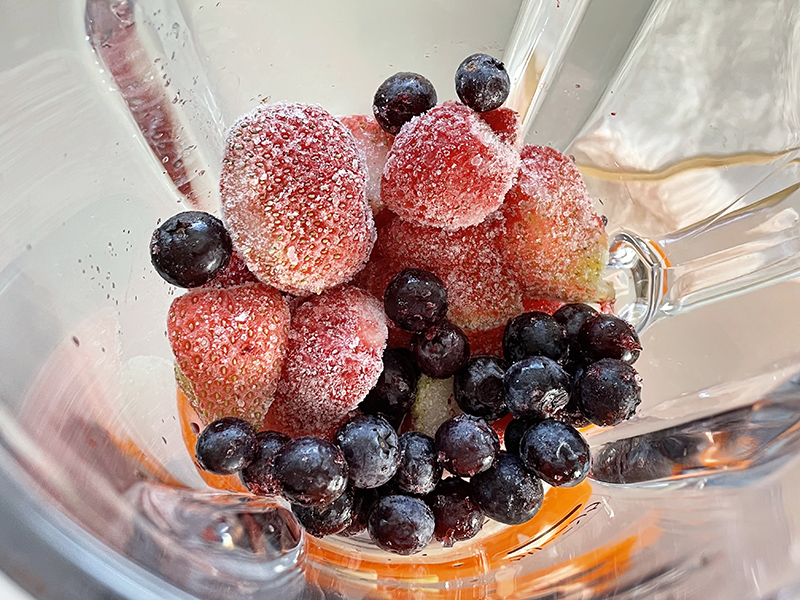冷凍のままイチゴとブルーベリーをミキサーへ投入、