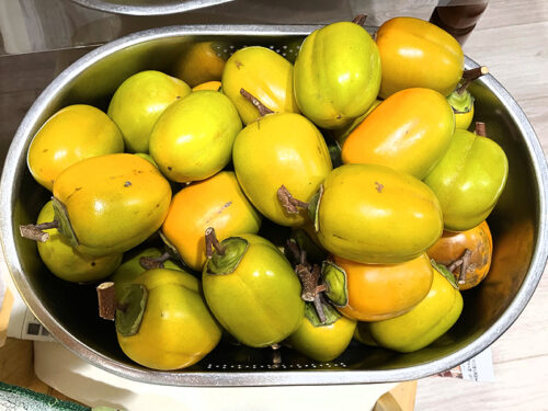 ご近所の方が届けてくれた西条柿、気温が下がったら干す準備をしようと思いあたためてました